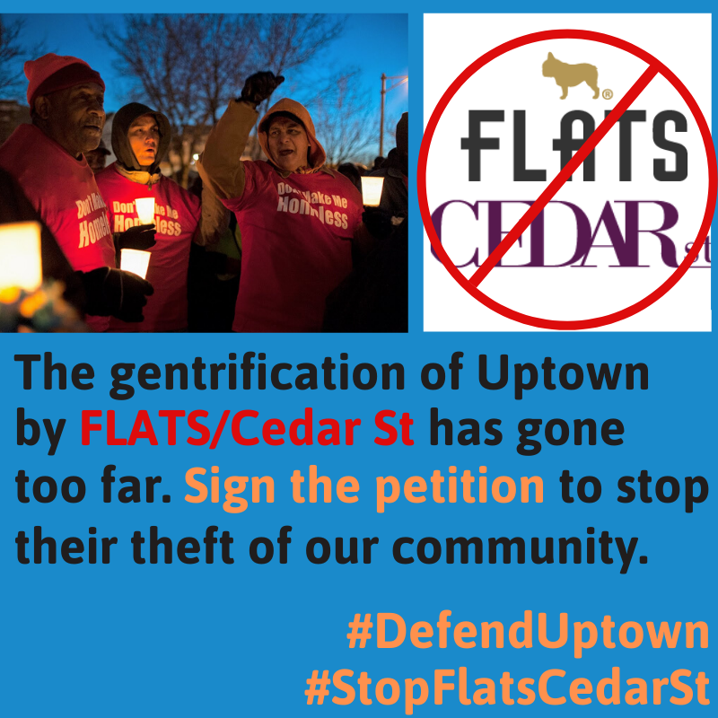 FLATS/Cedar Street is a luxury real estate developer with more than 2500 units. They have driven gentrification in Uptown and throughout the Northside over the last decade, causing mass displacement of community members & vital local institutions. Their recent purchases of two major northside social service hubs go too far. We are in danger of losing Uptown